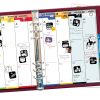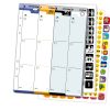 De week is in deze agenda verdeeld over twee pagina’s. Weekbladen waarop de dagen elk een eigen kleur hebben, elke werkdag heeft een eigen kolom met daarin voldoende ruimte om zelf iets te tekenen, schrijven of plakken. De Pictogenda heeft een duidelijke belijning en veel plakruimte gekregen. Achterin de agenda zitten stickervellen met pictogrammen voor school, sport, vrijetijd en andere categorieën. Natuurlijk zijn er ook weer emoticonstickers en complimentenstickers.