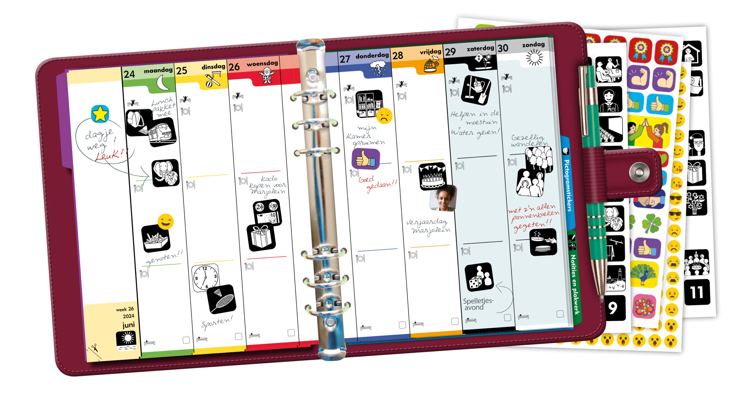 Deze unieke agenda is speciaal ontworpen voor iedereen die liever kijkt dan leest. Denk je in plaatjes? Dan is dit dé agenda voor jou (of voor degene die je begeleidt of verzorgt).